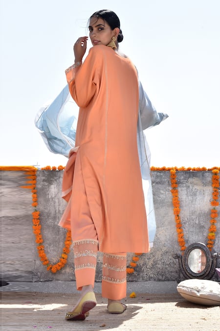 Buy_Kanika Sharma_Orange Tussar, Cotton Satin, Cotton, Silk Embroidery Hand Kurta Pant Set_at_Aza_Fashions