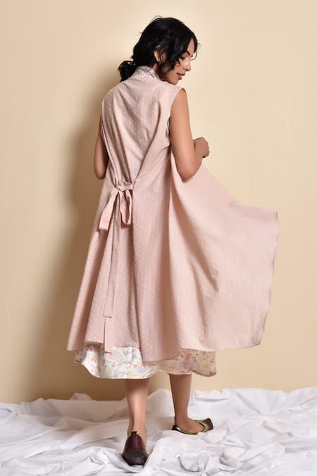 Embroidery >Hand embroidery >Asymmetric hem on jacket >Embroidered floral motifs on jacket collar >Back tie-up detail on jacket >Waist tassel tie-up on dress >Disclaimer: These are handwoven fabrics and there will be possibility of texture in it