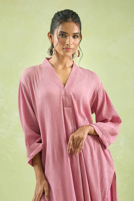 Pink kurta featuring a V-neck and three-quarter sleeves with thread embroidery. Paired with coordinating solid modal pant.