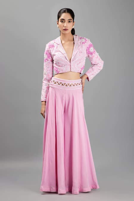 Pink crop jacket featuring lapel collar, full sleeves, and embellished with pearl, sequin, and cut dana floral vine motifs. Paired with an embroidered sharara with a cut-out waist design.