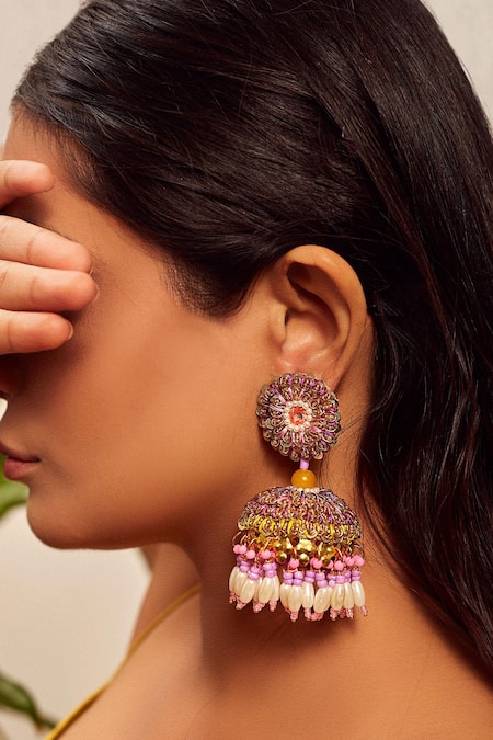 Pink jhumkis featuring intricate hand embroidery with thread, dabka, and bead drops