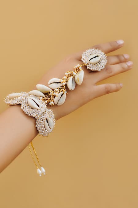 Off white haathphool set featuring cowrie shells, shell pearls & pearl trinkets. Includes a matching bracelet for a coordinated look.