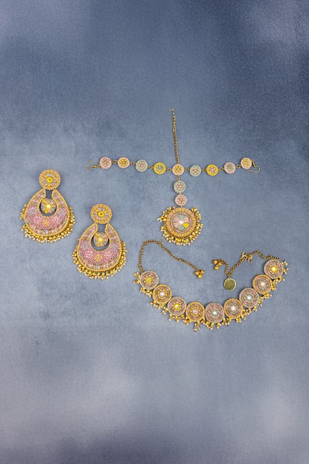Floral choker with intricate tikki and dabka work, Matching mathapatti maangtikka with floral elements, Dangling earrings with resham highlights