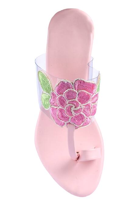 Hand embroidered floral motifs with tikki and dabka work., Transparent strap design for a modern look., Embellished heel with colorful beads.
