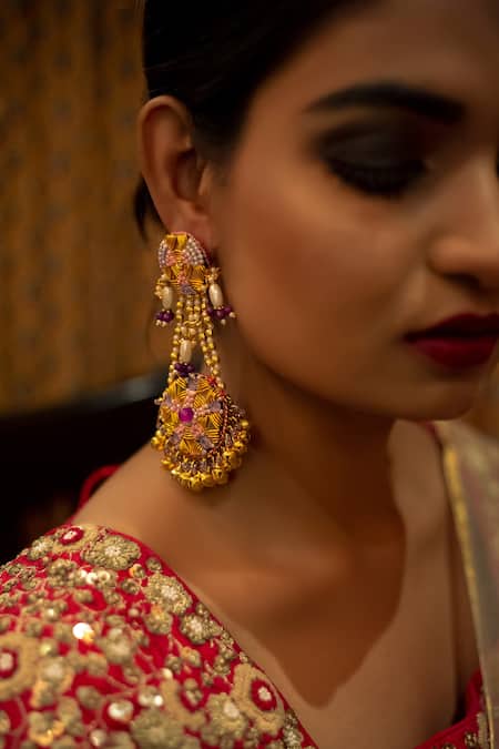 Multi colored hand embroidered long earrings featuring thread, dabka, abla, ghunghroo & moti embellishments