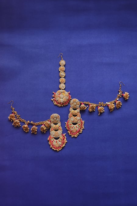 Multi color embroidered jewellery set featuring gold toned earrings with floral thread embroidery, dabka, and tikki work. Includes a matching mangtikka and a pair of earchains.