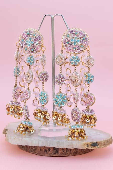 Gold toned long earrings featuring multicolor tikki, dabka, resham embroidery and ghungroo drops. Designed with a push back clasp for secure wear.