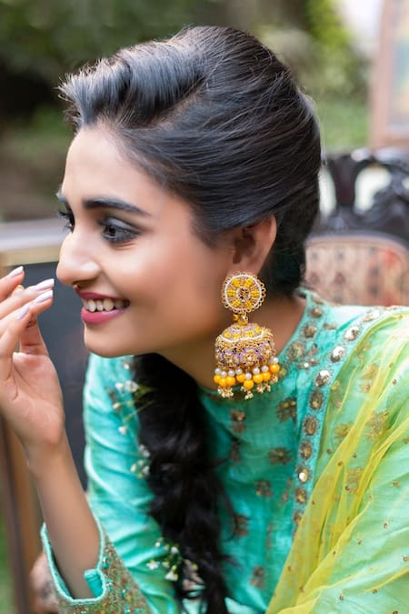 Yellow jhumkis featuring hand embroidery with thread and dabka, adorned with bead drops