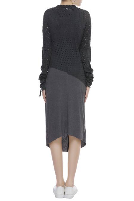 Boasts of an asymmetric hemline, this slate grey shrug, enhanced with all over cut-out detail ensures your chilly weekend escapes stay cozy, comfortable and stylish.