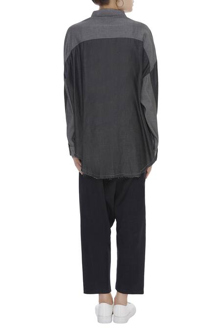 Look smart as you don this grey & black oversized denim shirt with panels & a quirky pocket.