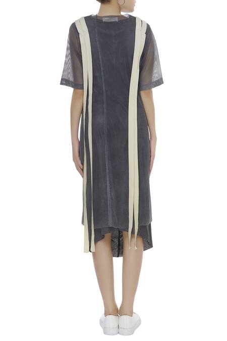 Style this grey mesh long t-shirt with a soild black midi dress to pose the perfect fashionista look. It features a quirky style of two parallel white stripes at the back.
