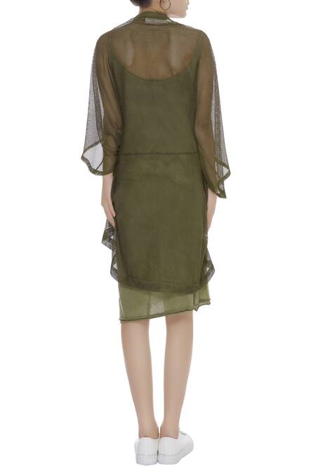A fierce statement making khaki mesh oversize long jacket constructed with an avant-garde aspect. Pair it up with an inner dress for a complete chic look.