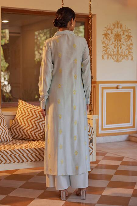 Blue tunic featuring floral threadwork motifs and a lapel collar. Paired with a matching palazzo for a complete look.