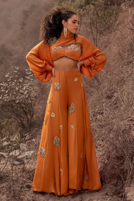 Orange Satin Chiffon Embroidered Sequin High Neck Cutout Jumpsuit