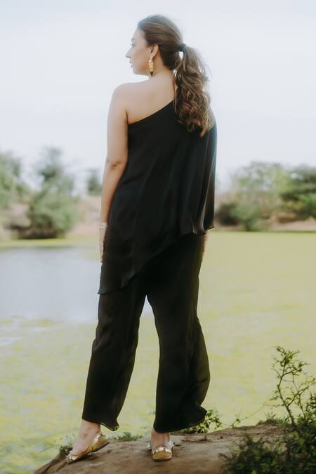 Black Satin, Chiffon, Polyester Embroidery One Shoulder Tunic And Pant Set