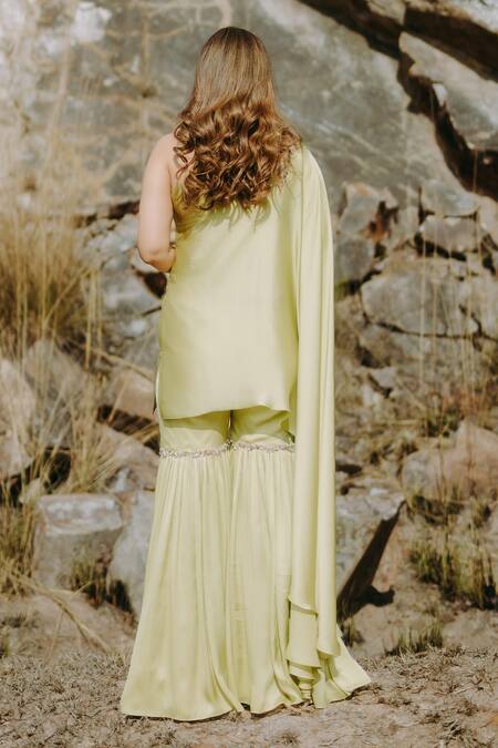 Green one-shoulder tunic featuring placement scatter embroidery. Paired with a matching sharara designed with intricate embellishments.