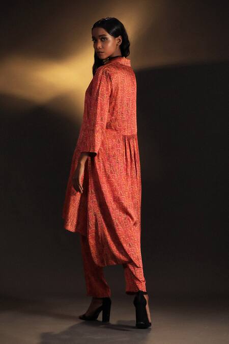 Candy pink and gold printed tunic featuring a spread collar and three-quarter sleeves. Paired with matching pants that have a side zip closure.
