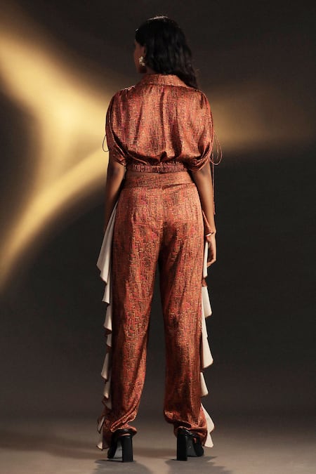 Gold Satin Collared Printed Top And Ruffle Pant Set