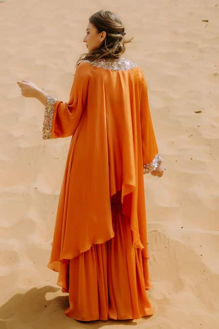 Orange high low kurta featuring flared sleeves and scatter sequin embroidery. Paired with a matching sharara, enhancing the fusion style.