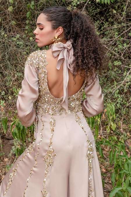 Scatter sequin embroidery on the bodice, Gathered sleeves with drawstring detail, High neck design with open back