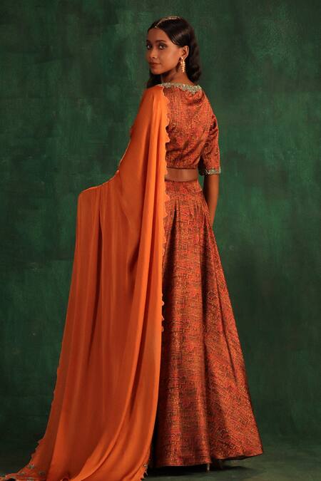 Hand embroidered padded blouse with sequins, Burnt orange scalloped dupatta, Tree bark print on satin fabric