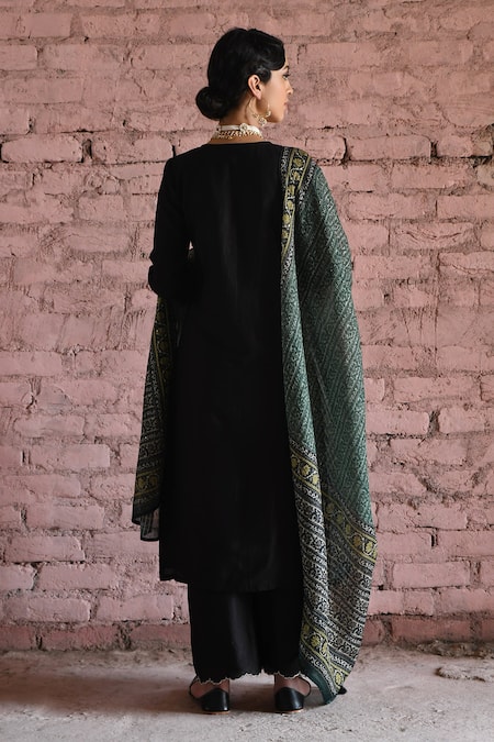 Black A-line kurta featuring a V-neckline and three-quarter sleeves. Paired with a pant that has scallop detailing at the hem and a Chanderi sequin embroidered dupatta.