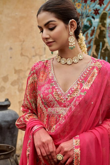 Pink chinnon A-Line kurta featuring aari and patti embroidery. Paired with a cotton silk pant and chiffon sequin embroidered dupatta.