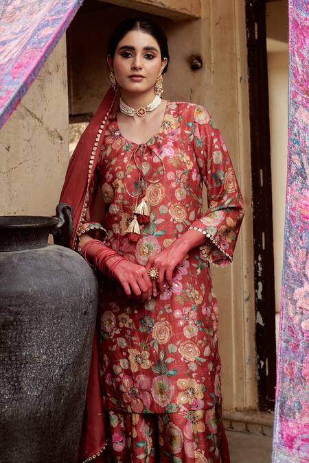 Light red kurta featuring bloom print with sequin and gota patti embroidery. Paired with a matching gharara and an organza dupatta with tassel border.
