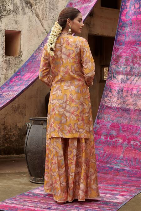 Mustard kurta featuring botanical print with sequin and bead embroidery. Paired with a matching gharara and organza dupatta with tassel borders.