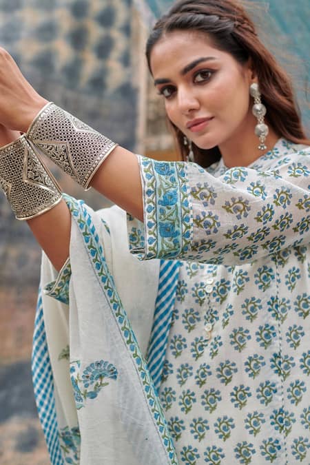 Blue kurta featuring butti print and gota patti embroidery. Paired with a cotton pant and a pure mul chanderi dupatta.