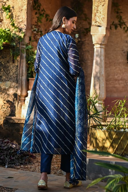 Navy blue chanderi kurta with gota embroidery & leheriya print. Paired with pant & printed chanderi dupatta.