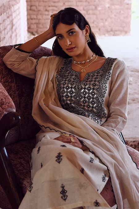 Ivory straight kurta featuring contrast thread embroidery and notched neckline. Paired with a cotton pant and kota doriya dupatta with scalloped hem.