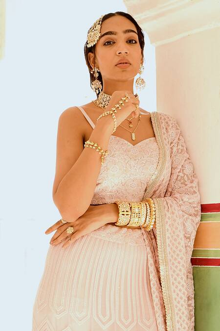 Pink lehenga featuring floral, paisley, and diamond chikankari work. Paired with a padded blouse and floral chikankari work dupatta.