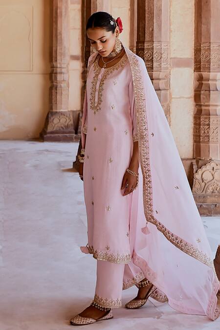 Pink Muslin, Organza Embroidery Round Neck Dori Work Kurta Pant Set