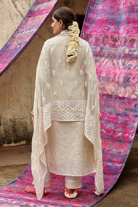 Ivory chanderi kurta featuring chikankari embroidery with a notched neckline and three quarter sleeves. Paired with a cotton pant and chiffon dupatta.