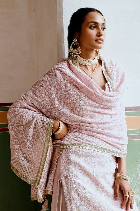Pink kurta featuring thread floral embroidery and a notched neckline. Paired with a gharara and a tassel bordered dupatta.