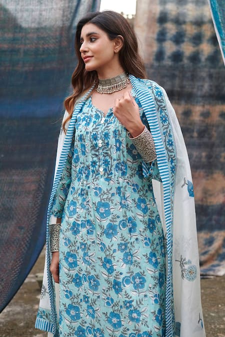 Blue kurta featuring a floral jaal print, complemented by a cotton pant and a dupatta in pure mul chanderi. The set includes a stylish three-quarter sleeve kurta with a notched neckline.