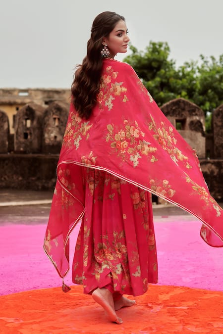 Pink anarkali featuring floral print with gota patti embroidery. Paired with a churidar and a tassel bordered organza dupatta.