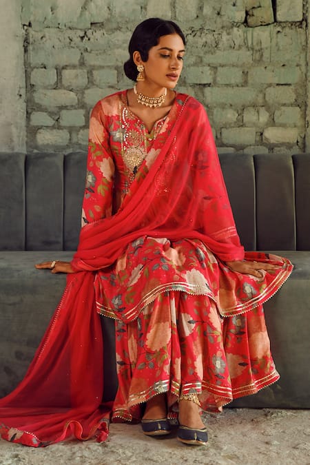 Hot pink floral printed anarkali featuring a V neck and straight three quarter sleeves. Paired with a pleated flared sharara and a chiffon dupatta.