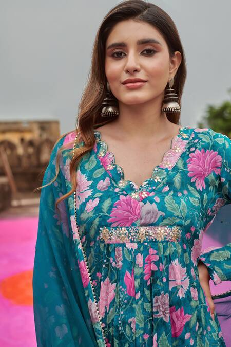 Teal green floral print chinnon kurta featuring sequin and bead embroidery. Paired with a cotton silk pant and chiffon dupatta.