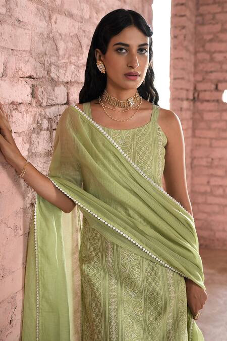 Buy_Karaj Jaipur_Green Chanderi, Cotton, Kota Doria Lace Round Hoor Chikankari Work Kurta Set _Online_at_Aza_Fashions