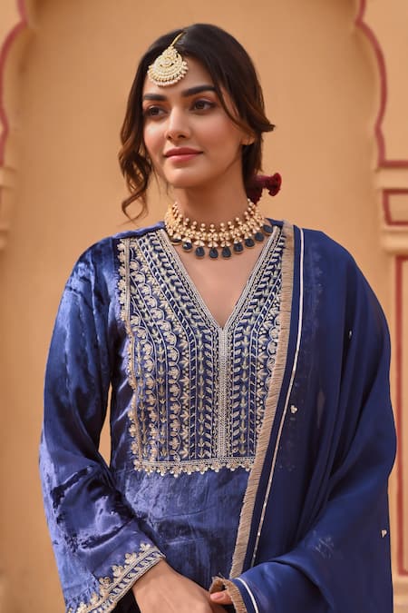 Blue velvet kurta featuring gardenia yoke embroidery with sequins and cut dana highlights. Paired with matching velvet pant and embellished organza dupatta.