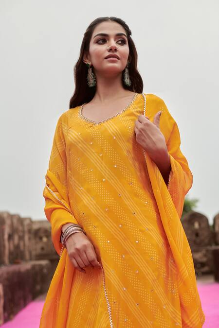 Yellow kurta featuring round V neckline with mirror and bead embroidery. Paired with matching shantoon pant and organza dupatta.