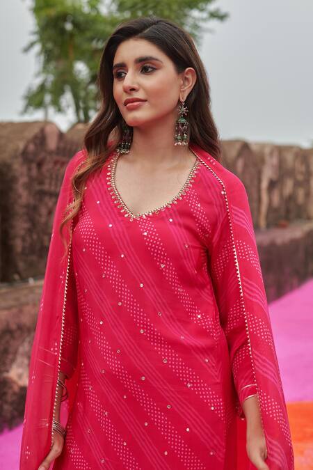 Pink kurta featuring a round V neckline with mirror and bead embroidery. Paired with a matching shantoon pant and organza dupatta.