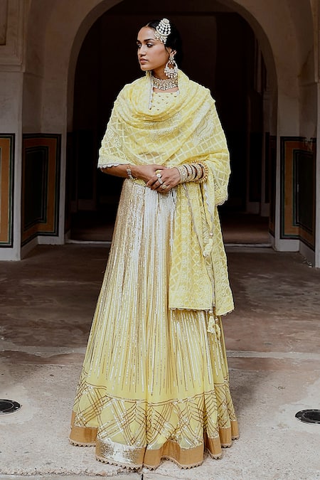 Yellow lehenga featuring sequin embellishments and an A-line flare with attached can-can. Paired with a padded chikankari blouse and scallop lace embroidered dupatta.