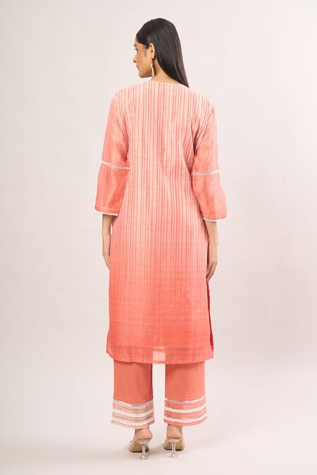 Buy_Karaj Jaipur_Peach Cotton Embroidery, Lace V-neck Ombre Floral Kurta Set