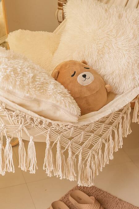 Off-white hammock with macrame woven motifs.
