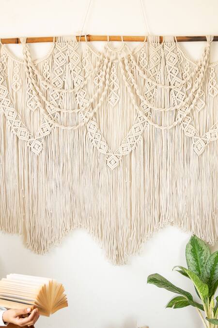 Off-white wall hanging with macrame woven motifs.