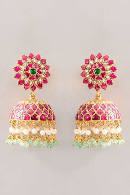 Pink Stones, Beads, Pearls Dharini Kundan Jhumkas