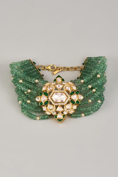 Green Beads, Crystals Flora Moissanite Polki Embellished Bracelet